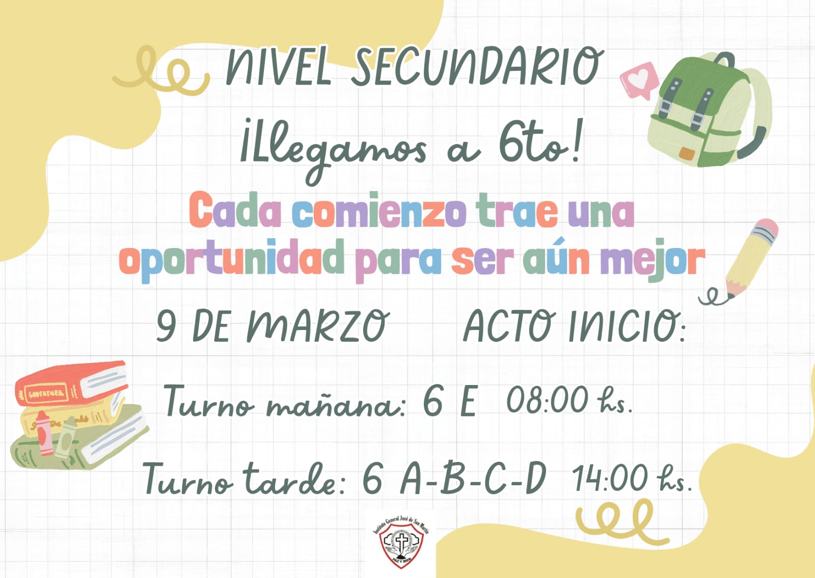 9 de marzo: Horario publicado: Los alumnos de Sexto Año ingresarán, junto a sus familias, para dar inicio a este gran año.